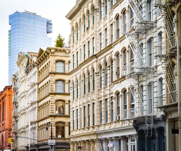 SoHo, which lies between Houston Street, Crosby Street, Canal Street and Sixth Avenue, is lined with historic cast-iron loft buildings with large factory windows and original columns. The streets are narrow and lined with cobblestones. There are a lot of new chic developments in Nolita, the northern part of Little Italy and Hudson Square to the west.